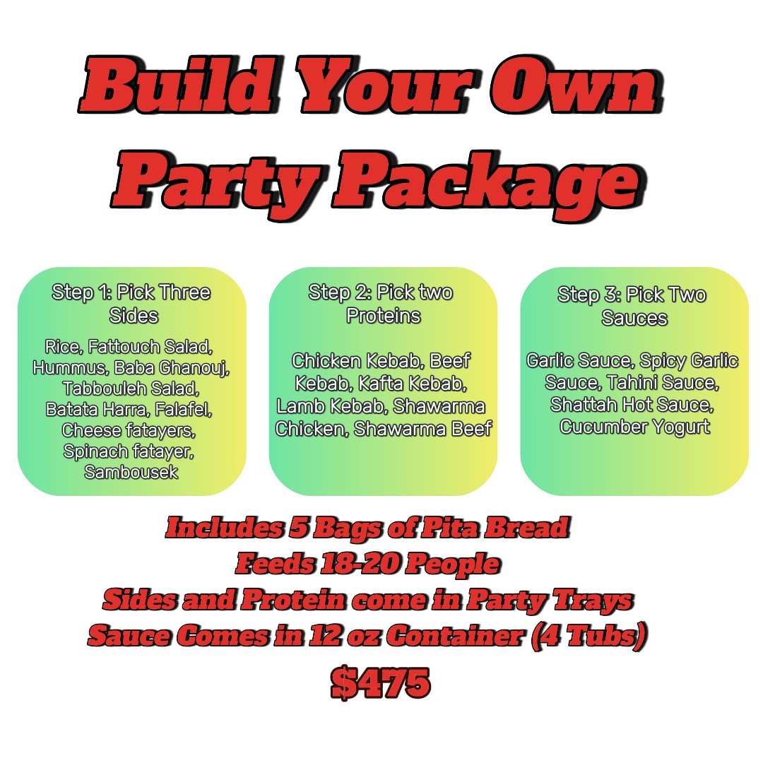 Includes: Large Tray of Rice, Large Tray of Fattouch Salad, 1 Small Tray of Hummus, 20 pieces of falafel, small shawarma mix tray, Large Tray of Kebabs including chicken, beef, and veggies, 10 cheese fatayer, 10 sambousek, five 12 oz container of garlic sauce, two 12 oz container of baba ghanouj, three 8 oz container of cucumber yogurt, 6 bags of pita bread